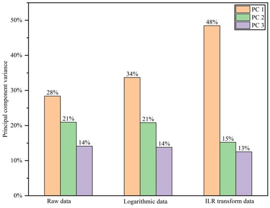 To enhance the clarity of how data closure affects multivariate analysis, PCA was applied to three data types in order to extract the most representative components from geochemical elements, thereby aiding in the characterization of geochemical behavior under varying geological conditions within the study area. Principal component variance contribution plots (Figure 7) and the plots of PCA (Figure 8) were generated for the original, logarithmic, and ilr-transformed datasets. As illustrated in Figure 7, the cumulative variance contributions of PC1, PC2, and PC3 accounted for 63%, 69%, and 76% in the original, logarithmic, and ilr datasets. Notably, PC1 alone explained 28%, 34%, and 48% of the total variance in the original, logarithmic, and ilr-transformed data, respectively. It is not difficult to see that after the ilr data transformation, its variance value is much larger than the values of the first two types of data, and PC1 is greater than PC2 and PC3. This indicates that the data has been opened, eliminating the interference of outliers, and can better interpret the spatio-temporal heterogeneity of elements. Therefore, the principal component of PC1 contains the most comprehensive information and is more representative. Moreover, the pattern PC1 > PC2 > PC3 was maintained, with PC1 exhibiting a much higher contribution than PC3, suggesting that the ilr transformation effectively minimized the influence of outliers and more accurately reflected the spatial and temporal heterogeneity of elemental distributions.