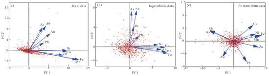 The scatter plots presented in Figure 8 indicate that the PC1 results derived from the original dataset (Figure 8a) and the logarithmically transformed dataset (Figure 8b) exhibit substantial similarity, with all nine elements showing positive loadings on PC1 and being distributed across the first and fourth quadrants. The majority of sample points are positioned near the origin, which can be attributed to the closure effect inherent in compositional data. In both datasets, weak inter-element correlations are observed, making it difficult to discern clear relationships among elemental groups. Compared to the original data, the sample points in the logarithmic dataset appear more dispersed, and a positive correlation between Au and Sb is observed. However, overall correlation differences among elements remain minimal, thereby limiting the visibility of distinct elemental associations. Similarly, the PC2 outcomes in both datasets are nearly identical. In contrast, the PC1 configuration derived from ilr-transformed data (Figure 8c) displays marked divergence from the previous two, with elements distributed across all four quadrants, signifying a more effective resolution of the closure effect. This transformation more accurately captures the spatial structure and geochemical characteristics of ore-forming elements. Notably, two distinct elemental associations emerge: PC1 is defined by positive loadings of Cu, Fe, Mn, Ni, Pb, and Zn, representing a medium- to high-temperature hydrothermal assemblage, which may reflect Cu-Pb-Zn polymetallic mineralization related to magmatic intrusion and structural fracturing. This elemental association closely corresponds to that observed in the adjacent negative groove mining area, where the known deposit comprises Cu-Pb-Zn elements. Conversely, negative loadings consist of Au, As, and Sb, which are indicative of low-temperature hydrothermal processes related to gold-antimony mineralization, commonly associated with structurally controlled fissures and magmatic hydrothermal systems.