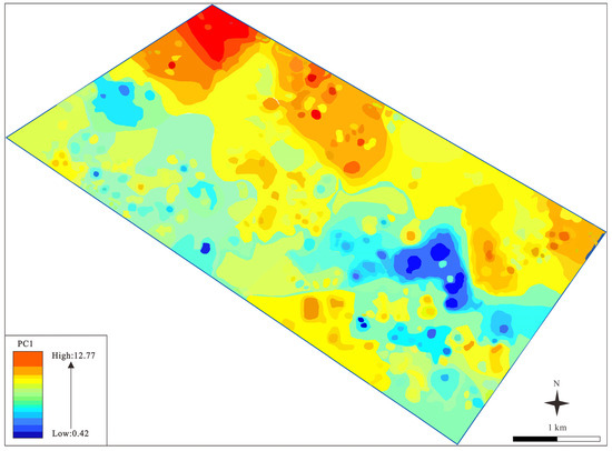 Based on the variance contributions, eigenvalues, and scatter plot characteristics derived from the three types of datasets, the results suggest that PC1 obtained through ilr transformation provides a more accurate explanation of the favorable ore-forming element associations within the study area. A principal component score distribution map was constructed using PC1 derived from the ilr-transformed data (Figure 9). This map reveals that high PC1 scores are predominantly concentrated in the northern and eastern portions of the study area, and the spatial pattern of these anomalies differs markedly from those observed in the other two data types. Low PC1 scores are primarily associated with the Lower Ordovician Yingou Group strata, which are indicative of structural fracture zones and intermediate-felsic intrusive rocks, implying the possible presence of a volcanic exhalative sedimentary mineralization system. Consequently, PC1 reflects the cumulative outcome of multiple geological processes. Under the influence of the regional metallogenic framework in the Hongyahuo area, PC1 serves as a representation of the spatial distribution characteristics of ore-forming element assemblages.