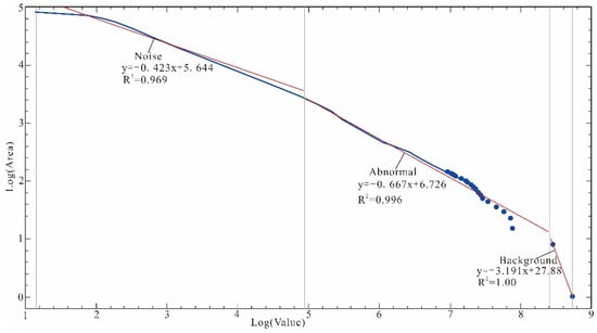 The tectonic-magmatic activities in the study area are frequent, and the regional geochemical characteristics are affected by geological tectonic movements at different times, making it difficult to distinguish the abnormal field and background field characteristics. At the same time, due to the influence of surface geology, many mineral-induced anomalies are manifested very slowly or are even invisible. The S-A multifractal extraction of geochemical anomalies can effectively separate weak anomalies from complex geochemical fields. Following the ilr transformation, inverse distance weighting interpolation was applied to the PC1 principal component data, which was subsequently converted into the frequency domain upon generation of the gridded dataset. The Fourier transform was then utilized to convert the data from the frequency domain back to the spatial domain, producing a double logarithmic (base-10) plot of spectral density S values exceeding a predefined threshold (Figure 10). Through least squares fitting, three linear segments separated by two inflection points were identified. These slope segments characterize the spatial self-similarity and fractal behavior of elemental distributions. As shown in Figure 11, the first regression equation, y = −0.423x + 5.644 (R2 = 0.969), corresponds to noise; the second, y = −0.667x + 6.726 (R2 = 0.996), represents geochemical anomalies; and the third, y = −3.191x + 27.88 (R2 = 1.000), reflects the geochemical background. The intersections of these lines yield cut-off thresholds defining three spectral filters. Specifically, the cut-off values between the right and middle segments and between the middle and left segments of PC1 are 4.949 and 8.413 (log10), respectively. For PC1, values of logS ≤ 4.949 are classified as noise; values within 4.949 < logS ≤ 8.413 correspond to anomalous regions; and logS > 8.413 is indicative of background signals. Based on these fitted threshold values, the complex geochemical structure was decomposed into PC1 background and anomalies (Figure 11) through the application of the inverse Fourier transformation.