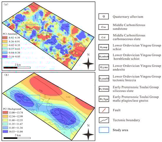 In the PC1 high background map (Figure 11b), regions of elevated and reduced background values are distributed along two north–south trending zones. The elevated background values in the northern section are predominantly associated with exposures of the Paleoproterozoic Tuolai Group strata. Conversely, in the southern portion of the study area, lower background values extend in both eastward and westward orientations. The lithological units corresponding to low background values are primarily composed of andesite and intermediate-felsic intrusive rocks interbedded with slate and sandstone, where well-developed fracture zones are present. Based on these spatial and lithological patterns, it can be inferred that the Paleoproterozoic Tuolai Group exhibits pronounced iron–nickel enrichment, potentially acting as a metal source contributing to the formation of medium-to-low-temperature ore-forming elements.