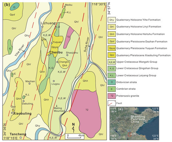15]. The Tancheng basin has a topography that is higher in the east and lower in the west, comprising three geographical areas: the east, the middle, and the west. The eastern part mainly consists of Malingshan, characterized by flattened low hills. The central part includes Meibu, Yuquan, and Liugou, located on the second terrace of the Yi River. The western part encompasses Lizhuang and Tancheng, featuring the first terrace of the Yi River, as well as the riverbed and floodplain. These three regions are aligned in a north–northeast direction, with the eastern part forming a divide between the two major rivers, the Yi and Shu Rivers (
