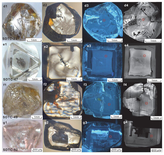 Photomicrographs of representative alluvial diamond samples from the Tancheng deposit, China. (a1–g1) Reflected light microscopy images illustrating surface textures; (a2–g2) polarized light microscopy views demonstrating internal strain patterns; (a3–g3) Diamond ViewTM (DV) fluorescence images revealing growth zoning; and (a4–g4) cathodoluminescence (CL) images displaying growth structures. Samples were selected to show characteristic features, including octahedral growth zoning, plastic deformation patterns, and surface dissolution textures. The red circles show plots of the Fourier transform infrared spectroscopy test.