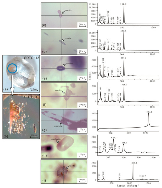 Mineral inclusions and corresponding Raman spectra from alluvial diamonds of the Tancheng deposit, China. (a) Reflected light microscopy images of diamond SD-TC-013; (b) photo of diamond thin slices after cutting and polishing; (c–f) coesite inclusions with different morphologies in diamond; (g) graphite inclusions in diamond; (h) omphacite inclusions in diamond; (i) calcite inclusions in diamonds.