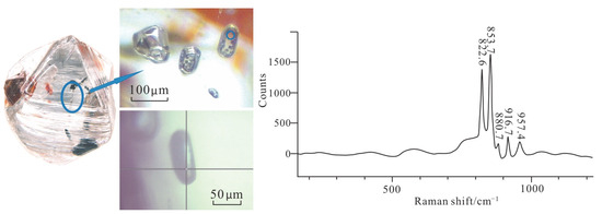 Laser Raman spectroscopy tests were carried out using a inVia Reflex laser Raman spectrometer (Renishaw, London, the United Kingdom). The excitation source was a solid-state laser with a wavelength of 532 nm and an energy output of 50 mW. A 50× objective lens was used, and the scanning range was set between 100 and 2000 cm−1. Raman shifts were calibrated using a silicon standard (520.5 ± 0.2 cm−1). Each sample was scanned three times to obtain internal inclusion characteristics and Raman spectrum data. The inclusions were analyzed in situ within the diamonds to maximize the preservation of the inclusion minerals, ensuring the accuracy of the Raman frequency shift data acquired during testing.