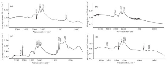 The FTIR strata of representative diamonds in Tancheng deposit. (a) SDTC-13 (IaA), (b) SDTC-62 (IIa), (c) SDTC-19 (IaB), and (d) SDTC-68 (IaAB).