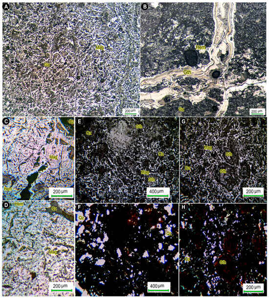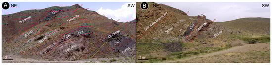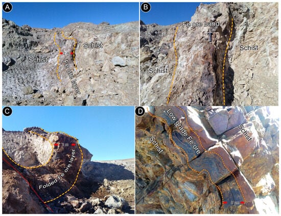 The metamorphism and deformation of the orebodies have hindered geological research in the Dehbid region. While some studies [20,21] have suggested a vein geometry for the iron mineralization in these deposits, detailed geological and structural investigations [17,19] reveal that a significant portion of the iron mineralization is stratiform to stratabound, consistently hosted in late Triassic-early Jurassic silicified dolomites and schists (Figure 5). However, in certain deposits, tectonic processes have also led to the concentration of Fe ores along more recent fault zones within carbonate rocks. The Madkansar deposit, also called Goushti-Heneshk, is the most significant iron mineralization in this district. Iron oxide mineralization occurs in lenticular orebodies, ranging from 100 to 700 m in length and 10 to 15 m in thickness. These orebodies exhibit a northwest–southeast trend, with a dip of approximately 40 to 50 degrees toward the northeast (Figure 3A). The mineralized dolomites and schists are thrust over the metamorphosed volcanic-sedimentary sequences of the late Triassic-early Jurassic, by a northwestern–southeastern trending reverse fault that dips towards the northeast.