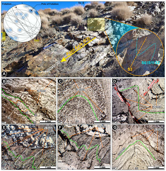 Field and microscopic evidence of polyfolding of metasediments (mica schist) in the study area and its geometric relation to Fe oxide mineralization. (A) Field view of folding of penetrative foliation (S2) in the study area. Structural measurements of foliation planes are represented in the equal area lower hemisphere projection at the top and left corners, with a close-up image of folded foliation (S0, S1, and S2) at the bottom right corner of the field image, respectively. (B) Microscopic view of three types of foliations (S1, S2, and S3) and the relic of iron oxide minerals. (C) Parallelism of iron oxide mineralization with respect to early (S0 = bedding) and metamorphic foliations (S1, S2, and S3). (D) Younger generation of iron oxide within the micro-fault crush zones. (E,F) Cross and plain polarized images of iron oxide veinlets parallel to penetrative foliation and S3 subparallel younger fractures. (G) Concordant folding of iron oxide lamina parallel to S0, S1, and S2. (PPL: Plain polarized light and CPL: Cross polarized light).