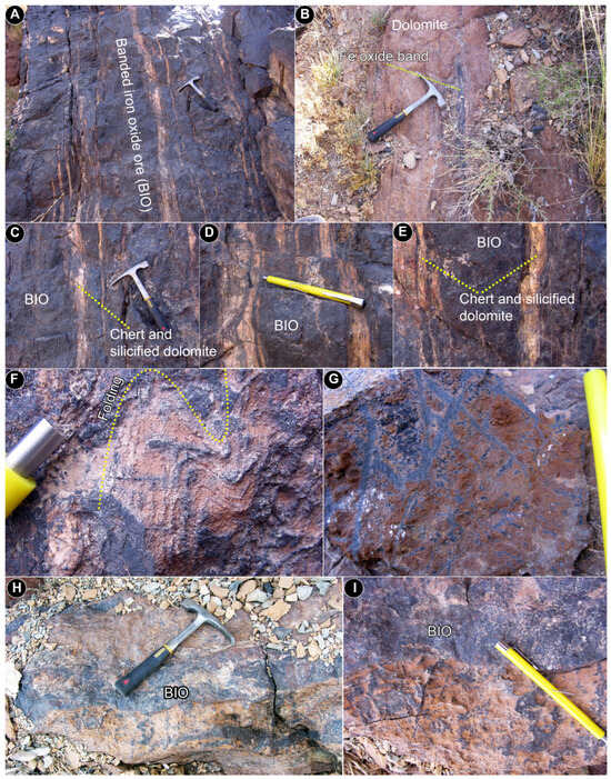 (A–E) Outcrop of stratiform BIO associated with chert and silicified dolomite. (F) Folding of iron oxide laminae within silicified dolomite. (G) Iron oxide veinlets in host rock fractures. (H,I) Iron oxide (magnetite and hematite) bands parallel to the host rock foliation.