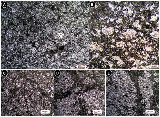Reflected light photomicrographs of magnetite (Mag) in massive banded iron ores. Magnetite exhibits lumpy microtextures (A–C) and is progressively replaced by hematite through martitization (D,E).
