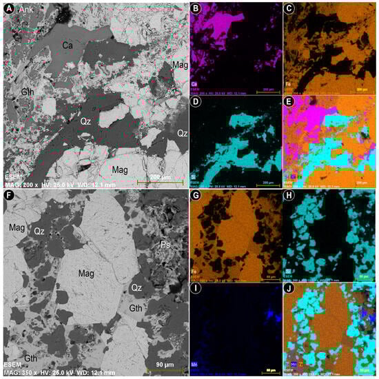 Scanning electron microscopy (SEM) images and elemental mapping of the polished section of Fe oxide ore, Heneshk deposit. The backscattered electron images (A,F) highlight the mineralogical diversity, including calcite (Ca), quartz (Qz), magnetite (Mag), goethite (Gth), psilomelane (Ps), and ankerite (Ank). Elemental maps (B–E,G–J) display the distribution of calcium, silicon, iron, and manganese across the sample, illustrating textural relationships and mineral associations within the iron ore matrix.