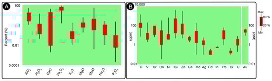 Box plot illustrating the major (A) and trace (B) element concentrations in the Dehbid banded iron ore deposits, highlighting maximum, minimum, and median values across the samples.