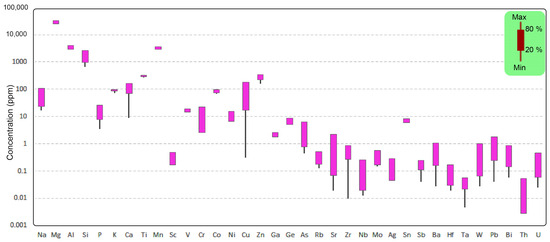 The analyzed Fe oxide ores exhibit low concentrations of trace elements, including Cr (av. 70 ppm), Co (av. 25 ppm), Ni (av. 42 ppm), Ag (av. 2 ppm), Mo (av. 28 ppm), and Pb (av. 18 ppm). In contrast, Cu (av. 519 ppm, reaching up to 4350 ppm) and Zn (av. 194 ppm, peaking at 3270 ppm) display significantly higher concentrations (Figure 10B). Additionally, Au shows a very low concentration, with a maximum of 48 ppb in the ore deposits [20].