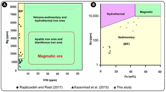 The plots of whole-rock geochemistry data of iron ores from the Dehbid BIO deposits [19,20] on (A) Mg vs. V/Ni [38], and (B) Ba-Fe (after [39]) diagrams.