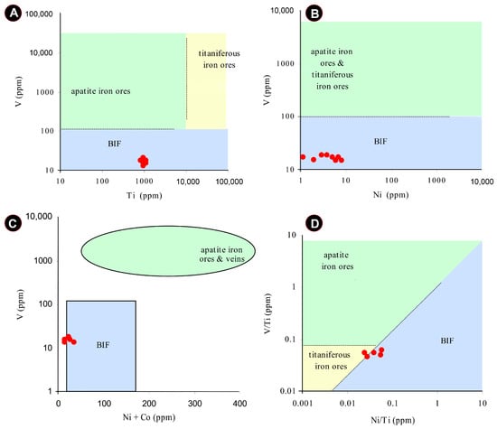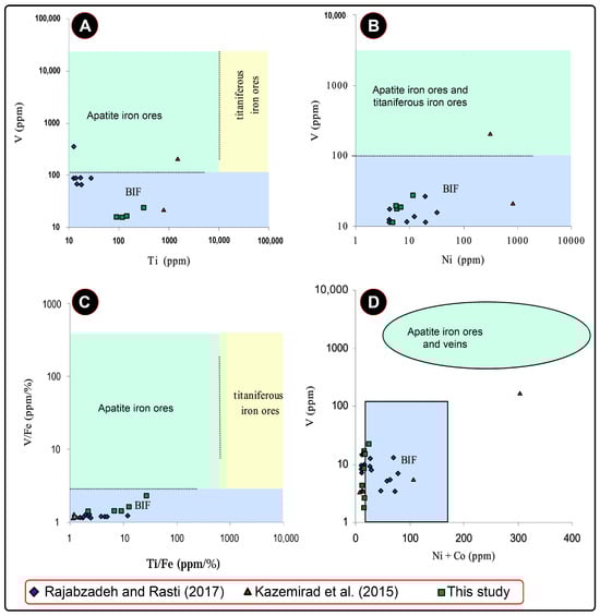 The plots of whole-rock geochemistry data of iron ores from the Dehbid BIO deposits [19,20] on V vs. Ti (A), V vs. Ni (B), V/Fe vs. Ti/Fe (C), and Ba vs. Fe (D) diagrams [40].