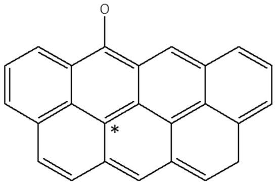 Carbonaceous materials are considered macrostructures formed mainly by aromatic clusters. For graphite, these aromatic clusters are parallel graphene layers, and for char, the structure is randomly connected by graphene clusters consisting of 3–7 benzene rings [17]. For the present study, the carbonaceous model used is represented by a finite cluster of a single graphene layer, where the edges terminate in hydrogen atoms, except for the top edge, where a single atom of oxygen was placed to simulate an oxidized carbonaceous surface (CM) (see Figure 1).