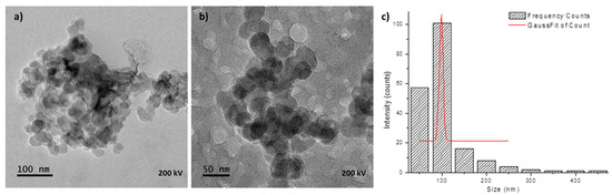 The presence of polystyrene nanoparticles was confirmed using TEM micrographs (Figure 4a,b). The shape of the particles was spherical, and they appeared to be covered with a ring or halo that may be associated with SDS surfactant (Figure 4a,b). The sizes were predominantly between 50 and 100 nm (Figure 4c). This size is related to the size of the micelles formed in the solution at the synthesis stage (A, Figure 3), as well as to the concentration of surfactant used. Al Najjar et al. [21] reported the 71 nm size of the nanoparticles when a surfactant is used in 1%, and a similar value was obtained in this investigation.