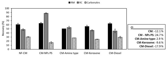 The RM is similar for all collectors and natural flotation (NF-CM: 60.4%; CM-NPs PS: 63.5%; CM-kerosene: 56%; CM-diesel: 62.8%). When amine is used, the non-carbonaceous material appears to be depressed (RM for CM-amine: 50.3%); however, the RC was not significantly higher than the RM, and this means that coal selectivity was not achieved. The carbonates in the concentration show a similar trend; only when the nanoparticle collector was used did the carbonates decrease, which may be related to a better concentration process. All this is corroborated by the CI values. The CI is 24.7% for flotation with nanoparticles, a value clearly higher than that obtained in natural flotation, as well as using amine, kerosene, and diesel. In general, the analysis of all these results indicates that the nanometric collector is the only reagent that allows for the separation of coal from this mineral with high selectivity.