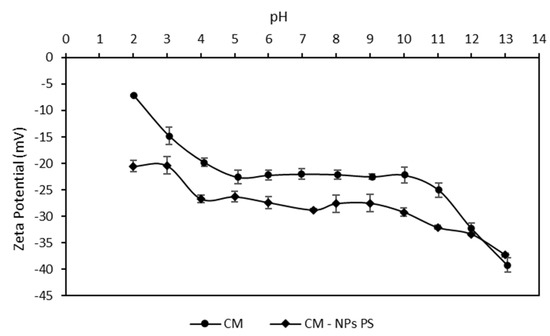 Figure 6 shows the plot of the zeta potential as a function of pH for the CM before and after conditioning with the nanoparticles. At pH 7, the value is negative, indicating that the CM surface charged negatively due to the sulfate group (-OSO−3−) that is oriented outwards from the micelle, that is, towards the aqueous. The negative charge increases up to pH 12, from which the same behavior as before conditioning is observed. When the pH decreases, there is a high concentration of H+; in this sense, Wolowicz and Staszak [27] reported the presence of energetically favorable interactions between H+ and the polar head of SDS surfactant micelles, via the replacement of Na+ with H+, protonating the polar head of the SDS. This is probably the reason why the zeta potential decreases under these acidic conditions of the solution. Moreover, there is no isoelectric point in the whole pH range. These results confirm the modification of the surface after conditioning [28,29]. The plot of the zeta potential for CM-NPs PS is lower than that of CM because when the nanoparticles adhere to the carbon, the surface negative charge density increases, increasing the electrostatic repulsion on the surface; unlike the CM, this has oxygenated groups whose dissociation depends on the pH of the medium, so the value of the zeta potential is moderate.