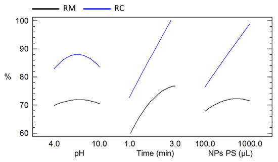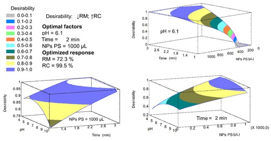 If the results are analyzed solely concerning the pH, it is observed that this variable does not have a significant influence on the RM, because the nanoparticles do not vary with pH. In other words, they do not agglutinate, since when SDS adsorbs to the surface of the nanoparticles, they manage to remain dispersed in water because an electrostatic repulsion is generated between nanoparticles due to the negative charge that covers them. Although stability studies were not performed at different pH values, it can be stated that they did not agglomerate, since the sulfate group of SDS is considered a strong acid and completely dissociates over a wide pH range [32].