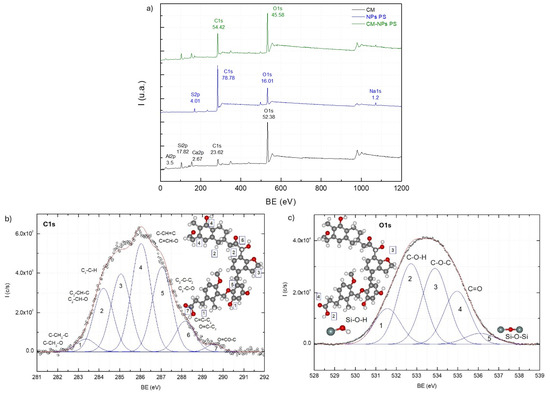 Figure 9a shows the full spectrum of the three materials: CM, PS NPs, and CM-PS NPs, in which the elemental composition and characteristic peaks of each chemical element are identified. In the case of CM, it is observed that there is a majority percentage of oxygen, logically associated with a large number of oxygenated surface groups, characteristic of this type of low-rank coal [38]. Other peaks such as aluminum, silicon, and calcium identified correspond with the phase composition reported by Vilasó et al. [9] for the CM sample. In the case of the nanoparticles, the main chemical element identified is carbon. The small percentage of sulfur is due precisely to the fact that these nanoparticles were coated with the SDS surfactant, as previously mentioned. When these nanoparticles adhere to carbon, it is observed that both the carbon and oxygen contents change, reaching a nearly 50:50 ratio, confirming the incorporation of the nanoparticles into the carbonaceous material.