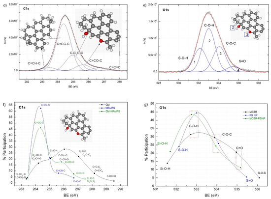 XPS wide energy spectrum of (a) survey of carbonaceous mineral (CM), polystyrene nanoparticles (NPs PS), and carbonaceous materials modified with nanoparticles (CM-NPs PS), (b) C1s peaks for (c) CM, (d) NPs PS, and (e) CM-NPs PS. O1s peaks for (c) CM, (f) CM-NPs PS and (g) comparation for O1s for MCBR, PS NP and MCBR-PS NP.