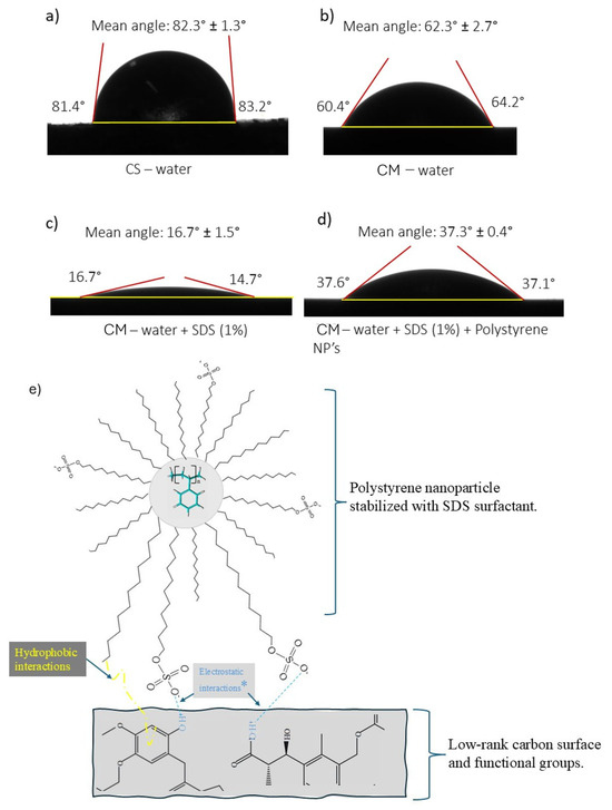 Contact angle results for different cases of interaction: (a) carbonaceous surface (clean) with water, (b) oxidized carbonaceous surfaces with water, (c) oxidized carbonaceous surface with a solution of water–surfactant, (d) oxidized carbonaceous surface with the dispersion of polystyrene nanoparticles, and (e) mechanism of interaction between CM and PS Nps. * This interaction only occurs when the pH of the flotation medium is acidic, and it might be thought that some functional groups would become protonated. At a neutral pH, the prevailing interactions are purely hydrophobic, through pi–pi interactions, for example.