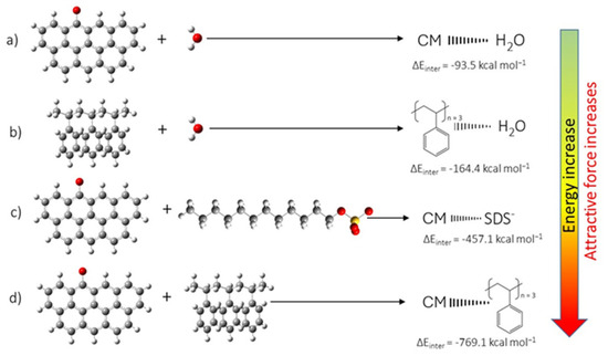 The energy of the interaction of the oxidized carbonaceous surface with different structures that participate in the flotation as polystyrene, SDS, and water was obtained using the models shown in Figure 11, considering a standard pair separation of D = 1 Å. The orientation of the interaction (parallel or vertical) leads to small differences in the calculated interaction energy (ΔEinter). Figure 11a shows the interaction between a water molecule and CM, where the result of ΔEinter = −93.5 kcal/mol is completely in agreement with the result of the contact angle measurement in Figure 10b. The negative value of energy indicates that attraction at the interface exists, leading to a certain level of wettability of the CM due to the apparition of van der Waals forces. In the same manner, the results in Figure 11b–d agree with the results of the contact angle in Figure 10, where the interaction of the polystyrene with CM was higher (ΔEinter = −769.1 kcal/mol) than the interaction of SDS with CM (ΔEinter = −457.1 kcal/mol), indicating that effectively, the polystyrene nanoparticles were adsorbed by the CM. This could be related to the fact that the hydrophobic forces appearing between CM and polystyrene are greater than those appearing in the interaction of the hydrophobic carbon chain of SDS and CM. It is important to consider that at this point, the concentration of SDS is smaller than the concentration of polystyrene nanoparticles. However, the energy of interaction for the OCS-SDS is still big, indicating that some of the molecules of SDS were also adsorbed by the CM.