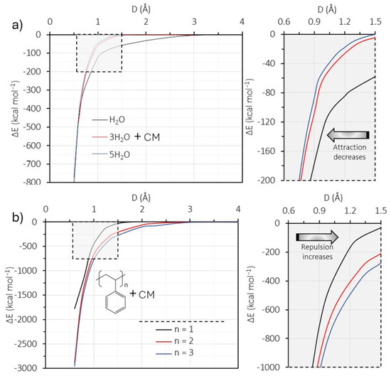 From Figure 11, there seems to be a contradiction of the results of the interactions of CM-H2O and CM–polystyrene. According to the previous description of the results in Figure 10d, a strong repulsion between polystyrene and water molecules should appear. However, according to the DFT results, the interaction of water–polystyrene was higher than that calculated for water–CM. This means that there is wettability at the polystyrene–water interface. However, when the size of the molecules that participated in the interaction is modified, it leads to a difference in the energy calculations. For example, Figure 12a shows the variation in interaction energies when the distance of separation is changed for water clusters of different sizes (1, 3, and 5). It can be noted that as the size of the water cluster increases, keeping the same distance of separation, the ΔEinter decreases significantly. This means that as the amount of water increases, the attractive forces decrease in the CM–water interface, being practically imperceptible under bulk conditions. On the other hand, Figure 12b shows that when the size of the polystyrene molecule increases (n = 1, 2, 3), an opposite effect is observed—the value of ΔEinter increases as the size of the polystyrene molecule increases. This fact means that as the polystyrene chain increases, the hydrophobic interaction increases accordingly. Therefore, for the results in Figure 12, a decrease in the interaction energy with the polystyrene nanoparticles is expected as the number of water molecules increases, leading to the apparition of strong repulsion forces.
