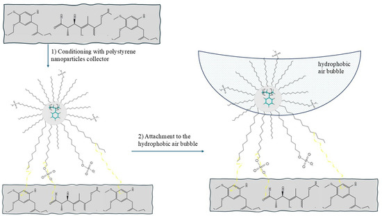 Although the contact angle is less than 90°, it can be stated that when polystyrene nanoparticles adhere to the coal surface, hydrophobicity increases, although it might be thought that the presence of SDS in the flotation of the carbonaceous mineral poses a serious disadvantage to the use of polystyrene nanoparticles to induce hydrophobicity. However, the experimental flotation results showed a 99.5% recovery of the coal; therefore, it can be considered that the polystyrene nanoparticles effectively induce the hydrophobicity of the oxidized coal particles in the flotation process (Figure 10e). It has been reported that when the surface of low-range carbons is modified with surfactant mixtures, the contact angle values vary, as obtained in this study, depending on the ratio of the surfactant content. Despite these values, the recovery percentages reached 78% [6]. It is important to consider that the nanoparticle suspension is dialyzed before being used in flotation, which implies a reduction in the SDS concentration in the collector. In addition, when the mineral is conditioned for flotation, fresh water is added, which further reduces the SDS concentration. All this makes the effect of surfactant molecules at the solid–liquid interface negligible, and hence, the repulsion forces between water molecules and polystyrene nanoparticles dominate, providing hydrophobicity to the CM and facilitating attachment with the air bubbles. It is inferred that this dilution did not cause a very low SDS concentration, because if it had, the nanoparticles would have been destabilized, and this would have affected the flotation results, which was not the case.