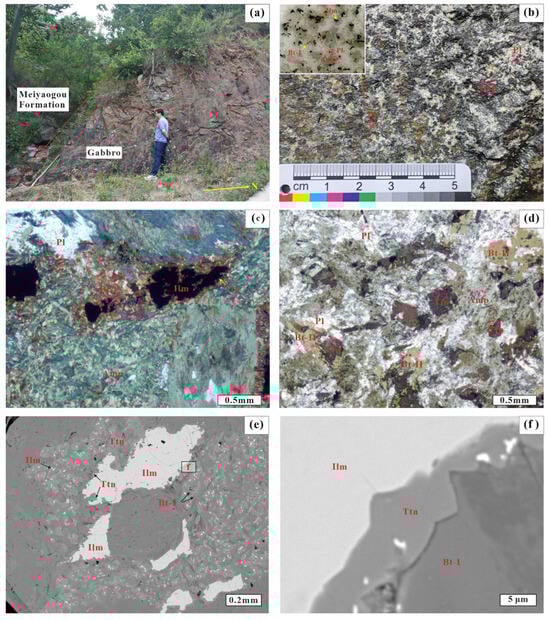 Field photographs and microphotographs of the Luanchuan gabbro. (a) Field outcrop of the Luanchuan gabbro intruding into the schist of the Meiyaogou Formation; (b) Luanchuan gabbro hand specimen exhibiting dominant plagioclase and amphibole, with a photograph of a thin section revealing minor ilmenite and biotite; (c) microphotograph of biotite I showing a dark reddish-brown fine texture and replacing black residual ilmenite (plane-polarized light); (d) microphotograph of biotite II showing a light gray-grayish brown subhedral texture and associated with amphibole and plagioclase (plane-polarized light); (e,f) BSE images of biotite I and ilmenite showing corona and replaced textures. Mineral abbreviations: Amp—amphibole; Pl—plagioclase; Ttn—titanite; Ilm—ilmenite; Bt—biotite.