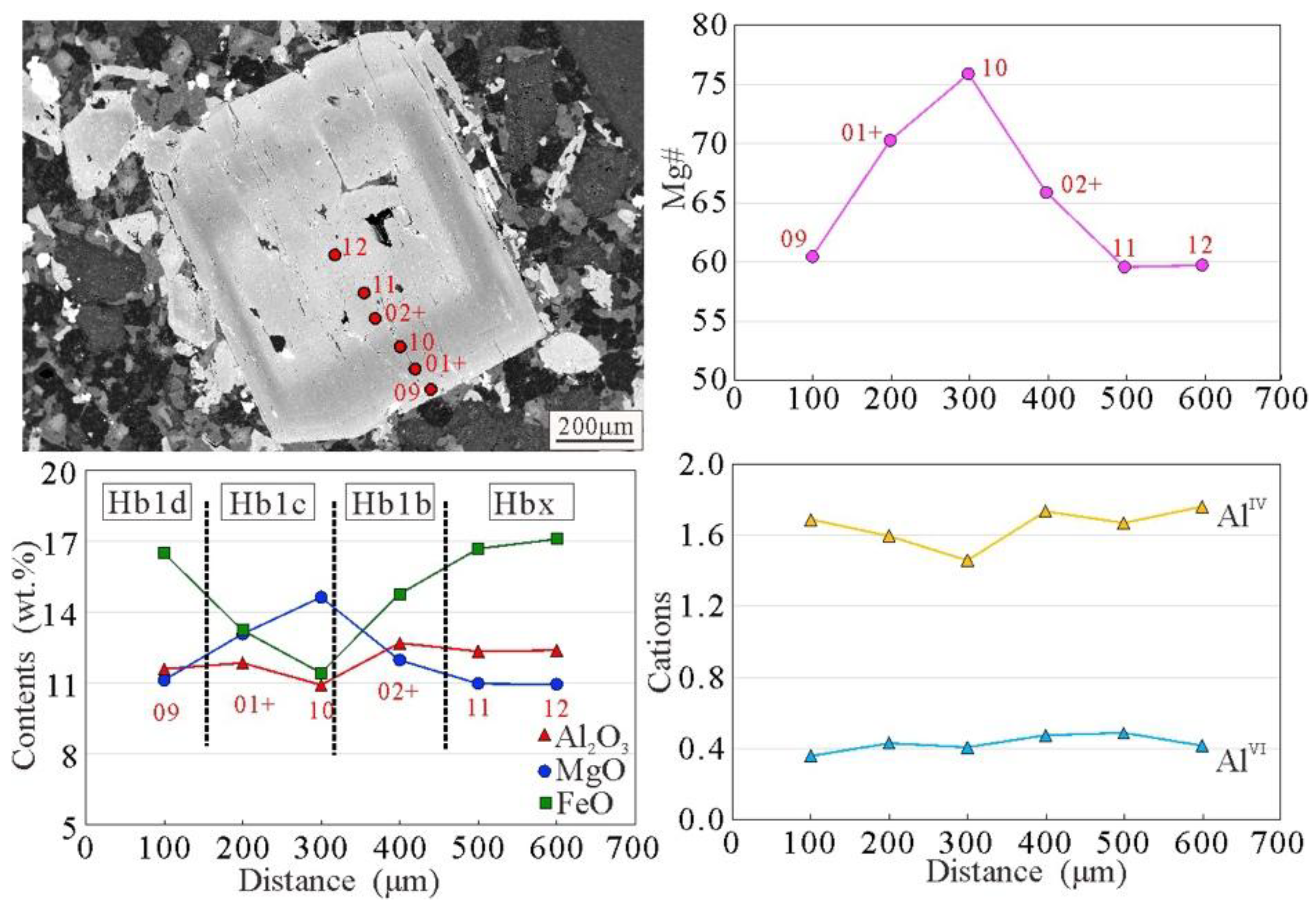 WDS mapping on the four-zoned hornblende phenocryst (sample 18JG-1) reveals oscillatory zoning of Mg, Fe, Al, Ca, Ti, and Cr (Figure 4). In zones Hb1a, Hb1b, and Hb1c, Mg content is higher in the inner sub-zones and lower in the outer ones, and the opposite is true for the Fe, Al, and Ti contents. The inner high-Mg, low-Fe sub-zone is wider than the outer low-Mg, high-Fe sub-zone. A distinct low-Ti-Cr and high-Mg domain is present in the core (Hb1a), which likely represents the residue of an early-crystallized hornblende (Hb0). Furthermore, a very thin band (Hb1d) is locally developed on the Hb1c margin. High Cr concentration is only distributed within Hb1a, and the Cr content is generally below the detection limit in zones Hb1b, Hb1c, and Hb1d.