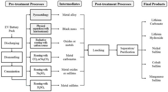 Since Sungeel Hitech’s recycling process includes thermal treatment steps conducted at approximately 700 °C, roasting processes that produce various intermediate products at similar temperature ranges have been extensively studied. In Figure 1, these alternative recycling processes involving roasting are summarized [2]. As lithium-ion battery recycling processes produce metal compounds such as sulfates, carbonates, and hydroxides for use as lithium-ion battery raw materials [2,4,9], these processes can be classified according to the type of intermediate products. Various recycling processes have been researched to replace Sungeel Hitech’s current process, which produces black mass through a combination of physical separation and thermal treatment.