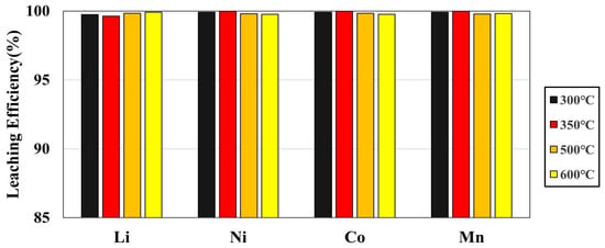 Effect of roasting temperature on the leaching efficiencies of Li, Ni, Co, and Mn during the recycling process of sulfuric acid roasting (1.5 mL H2SO4/g sample, 1 h roasting time) followed by water leaching (50 °C; 200 rpm, 5% pulp density, 1 h leaching time).