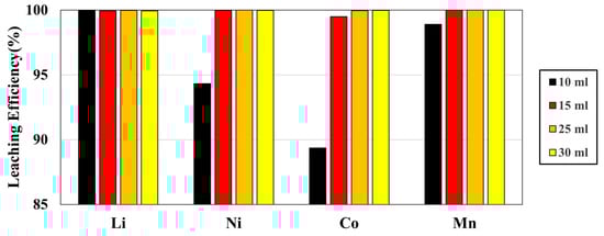 The effect of mixing ratio on sulfuric acid roasting was investigated by preparing mixtures containing 10 g of cathode scrap with varying amounts (10–30 mL) of 95% sulfuric acid. The sulfuric-acid roasting was performed with the mixture of 10 g of cathode active material scrap powder and 15 mL to 30 mL of 95% sulfuric acid at 350 °C for 1 h. The leaching test was conducted at 50 °C and 200 rpm with 5% pulp density for 1 h. As can be seen in Figure 4, lithium showed leaching efficiencies exceeding 99.9% under all mixing ratio conditions; however, the other three metals (nickel, cobalt, and manganese) did not achieve 99.9% leaching efficiency when mixed with only 10 mL of sulfuric acid. Notably, cobalt exhibited leaching efficiencies of 89.4% and 99.5% when mixed with 10 mL and 15 mL of sulfuric acid, respectively. When the sulfuric acid amount was increased to 25 mL, all four metals achieved leaching efficiencies above 99.9%. Based on the weighted average atomic mass of Ni, Co, and Mn (calculated to be 57.8 g/mol), the 10 g of cathode scrap containing these metals is equivalent to approximately 0.1 mole. Lithium sulfate (Li2SO4) has a 1:2 molar ratio between lithium and sulfate, while metal sulfates such as NiSO4 maintain a 1:1 molar ratio. Theoretically, 0.15 mole of sulfuric acid is required to convert the metals such as Li, Ni, Co, and Mn in the cathode scrap into their respective sulfates. Although 10 mL of 95% sulfuric acid corresponds to 0.18 mole, which is theoretically sufficient, the experimental results showed that this amount was inadequate for complete conversion. A significantly higher amount of 25 mL (0.45 mole) of sulfuric acid was required to achieve complete metal sulfate formation, which corresponds to three times the theoretical stoichiometric requirement of 0.15 mole.
