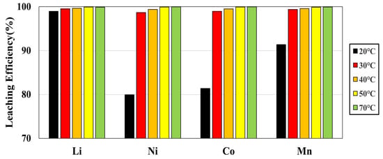 Effect of leaching temperature on the leaching efficiencies of Li, Ni, Co, and Mn during the recycling process of sulfuric acid roasting (3 mL H2SO4/g sample, 1 h roasting time, 500 °C) followed by water leaching (20–50 °C, 200 rpm, 5% pulp density, 1 h leaching time).