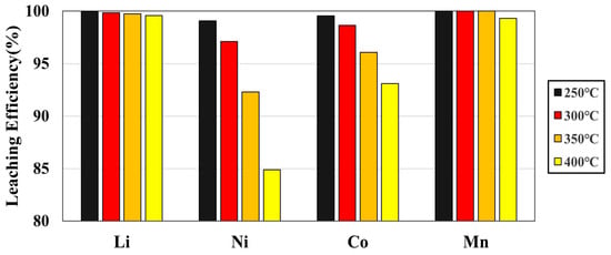Generally, black mass contains graphite as anode active materials as well as cathode active materials. Although research on the recovery of graphite from black mass using a flotation process was performed [20], the separation of cathode and anode active materials is not currently a standard process. Therefore, a recycling process consisting of sulfuric acid roasting followed by water leaching was tested with the black mass sample. The sulfuric acid roasting was performed with a mixture of 10 g of cathode active material scrap powder and 25 mL of 95% sulfuric acid for 1 h. The leaching test was conducted at 50 °C and 200 rpm with 5% pulp density for 1 h. The leaching results at roasting temperatures from 250 °C to 400 °C are shown in Figure 6. The leaching efficiencies decreased with increasing roasting temperature from 250 °C to 400 °C, with nickel and cobalt achieving >99% recovery at 250 °C but declining to 84.9% and 93.1%, respectively, at 400 °C roasting temperature. The black mass was obtained by dismantling and crushing a spent battery pack, while the cathode scrap was obtained from battery manufacturing processes. Therefore, another sample was prepared by adding graphite reagent to the cathode scrap to investigate the effect of graphite on the sulfuric acid roasting process.