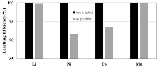 Two kinds of samples were prepared, one consisting of 10 g of cathode scrap (without graphite) and the other containing 5 g of cathode scrap and 5 g of graphite powder (with graphite). The samples were roasted at 350 °C for 1 h with 2.5 mL H2SO4/g sample, and subsequently leached at 50 °C and 200 rpm with 5% pulp density for 1 h. As shown in Figure 7, the cathode scrap without graphite exhibited leaching efficiencies exceeding 99.9%, whereas the samples containing graphite showed comparatively lower leaching efficiencies for nickel and cobalt at 91.6% and 93.4%, respectively. Despite the graphite-containing samples having only half the amount of cathode material (5 g) and therefore receiving twice the relative sulfuric acid dosage, they demonstrated lower leaching efficiencies. This suggests that the presence of graphite adversely affects the leaching efficiencies of metals.