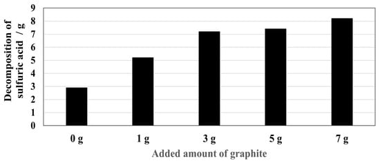The effect of graphite on sulfuric acid decomposition was investigated as follows: Samples were prepared by adding varying amounts of graphite (0–7 g) to 25 mL of sulfuric acid, and subsequently, the samples were roasted at 350 °C for 30 min. The weights before and after roasting were measured to calculate the amount of decomposed sulfuric acid, and the results are presented in Figure 8. The amount of decomposed sulfuric acid increased with increasing graphite content, indicating that graphite addition accelerates the decomposition of sulfuric acid.