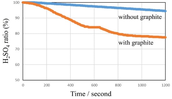 Another test was performed to investigate the effect of graphite addition on the decomposition of sulfuric acid at 300 °C for 20 min with 1 g sulfuric acid with or without 0.5 g graphite. As shown in Figure 9, the remaining sulfuric acid was 77.6% in the sample with graphite and 94.5% in the sample without graphite, demonstrating the accelerating effect of graphite on sulfuric acid decomposition.