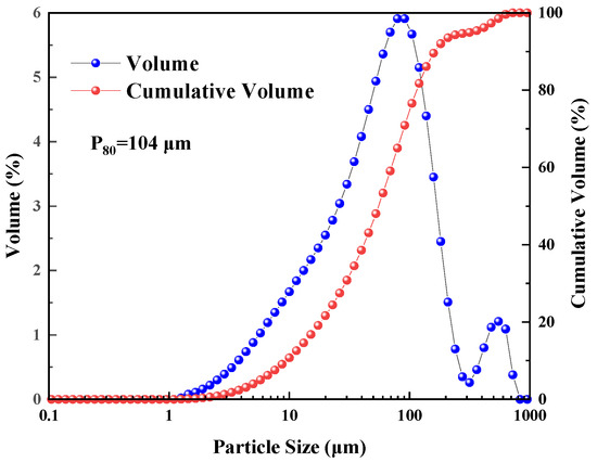The galena sample used in this study was purchased from the Mingfa Mineral Specimen Company in Guangzhou, China and is sourced from a medium-low temperature hydrothermal deposit. The X-ray fluorescence (XRF) analysis, which was performed using an Axios mAX device made by PANalytical, which was located in Almelo, The Netherlands, showed that it contained 85.83% Pb, which meant that the purity of galena was 99.09%. Following hand selection, crushing, and grinding, the galena sample exhibited the particle size distribution shown in Figure 1, with 65% of the particles smaller than 74 μm. As shown in Figure 1, since the minerals were crushed below 200 μm in the crushing stage, and grinding in the grinding stage targeted minerals under 100 μm from the crushing product, the minerals in the 100–200 μm range were not ground. Thus, the laser particle size analysis results of galena showed a second peak, with the maximum particle size around 200 μm.