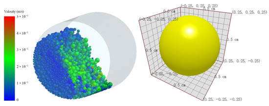In this study, the grinding process in a ball mill was numerically simulated using the discrete element method (DEM) to elucidate the motion behavior of the grinding media and investigate the mechanisms by which the grinding parameters influence the fine-grinding efficiency of galena. The ball mill model and the reference model of the steel ball media used in the DEM simulation are shown in Figure 3. Figure 3 only shows the model of the 5 cm ball; models of the 3 cm and 2 cm balls were also used in the simulation, matching the actual grinding experiment. The Hertz–Mindlin (no slip) contact model was employed in the simulation, as it effectively predicts the motion state of the media group within the ball mill [29]. The particle contact parameters are listed in Table 2. Each simulation ran for a total duration of 5 s, divided into 50 time steps, with a step size of 0.1 s. This study utilized EDEM commercial software (EDEM 2022, Altair, Troy, MI, USA).
