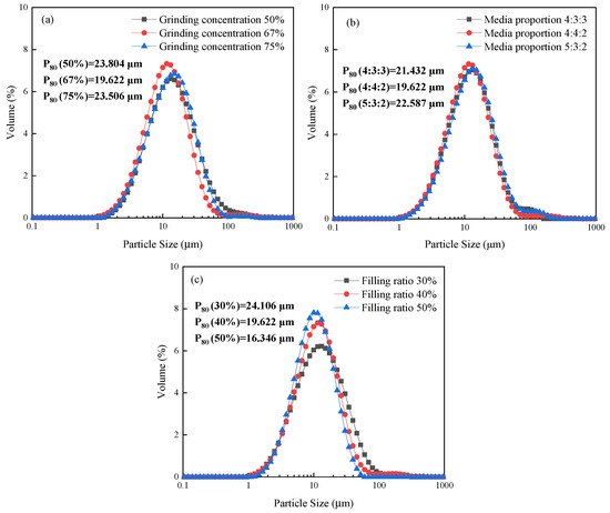 Particle size distribution curve of the fine-ground galena products obtained from different (a) grinding concentration, (b) media proportion, and (c) filling ratio.
