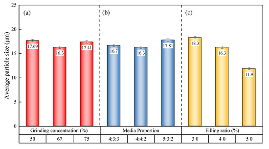 Average particle size of the fine-ground galena products obtained from different (a) grinding concentration, (b) media proportion, and (c) filling ratio.