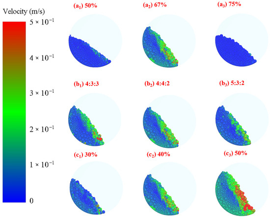 The motion state of the grinding media in the mill was analyzed using discrete element simulation to elucidate the influence of different grinding parameters on fine grinding performance in the grinding experiments [33,34]. The velocity cloud diagram of the media group is presented in Figure 8. Generally, a higher motion velocity of the media group corresponds to a larger effective grinding area, enhancing material breakage [35]. As shown in Figure 8, with increasing grinding concentration or adjusting the media proportion from 4:3:3 to 5:3:2, the motion velocity of the media group first increased and then decreased. In contrast, the motion velocity of the media group increased progressively with an increase in the filling ratio. At a filling ratio of 50%, the media group exhibited the highest motion velocity, resulting in the most effective crushing and grinding of materials. This phenomenon occurs because an increase in the filling rate leads to a greater overall media volume, raising the shoulder position of the media balls within the rotating cylinder. Consequently, the potential energy increases and is progressively converted into kinetic energy during descent, thereby increasing the motion velocity of the media balls [36].
