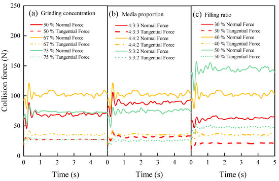 The variation in normal and tangential collision forces with time of different (a) grinding concentration, (b) media proportion, and (c) filling ratio.