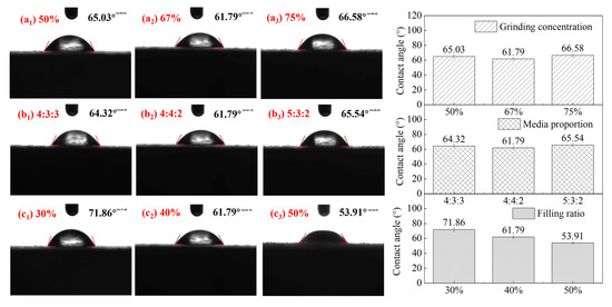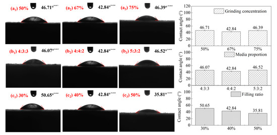 Influence of (a) grinding concentration, (b) media proportion, and (c) filling rate on the surface contact angle of the fine-ground galena products (pH = 9, sodium diethyldithiocarbamate trihydrate = 10 g/Mg).