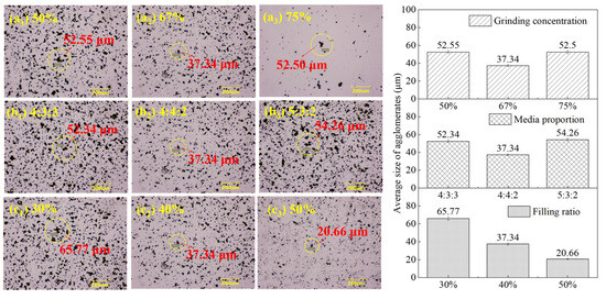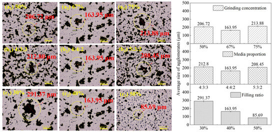 Due to variations in the surface wettability of minerals with different particle sizes, the agglomeration behavior of particles changes during flotation, with larger agglomerate size exhibiting better floatability [44,45]. The effects of the grinding parameters on the average agglomerate size of the fine-ground galena products, under conditions without a collector and with a collector dosage of 10 g/Mg, are shown in Figure 12 and Figure 13. The average agglomerate size values and error bars presented in the bar chart on the right are derived from the measurement of the largest agglomerate size during each of the ten observations. Each photo on the left is selected from ten observations of a single stirring experiment to best represent the average agglomerate size and the most representative agglomerates. Based on the particle size analysis, Figure 12 and Figure 13, when grinding parameters such as the grinding concentration, media proportion, and filling ratio were adjusted, the −10 μm yield in fine-ground galena products rose, the average agglomerate size decreased, and the galena recovery declined. Specifically, at a filling rate of 50%, the −10 μm yield peaked, the average agglomerate size was minimal, and the galena recovery was lowest.