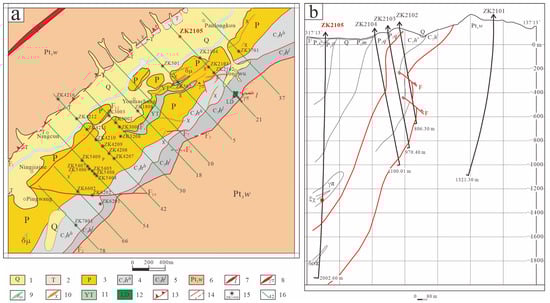 Simplified map of the deployment of the exploration project of the Zhuxi W-Cu polymetallic deposit: (a) Simplified geological map of the Zhuxi mining area (1—Quaternary strata; 2—Triassic strata; 3—Permian strata; 4—Upper Carboniferous Series Huanglong Formation; 5—Upper Carboniferous Series Huanglong Formation; 6—Upper Proterozoic Wannian Group; 7—aplite; 8—granite porphyry; 9—diorite porphyrite; 10—lamprophyre; 11—tremolite actinization zone; 12—green alteration zone; 13—thrust nappe fault; 14—measured (presumed) fault; 15—locations and the number of drill holes; 16—exploration line and the number of exploration lines) (revised from [29]). (b) Profile map of the 21st exploration line in the Zaolin ore section in the Zhuxi mining area.