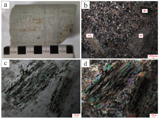 Hand samples and microscopic characteristics of the biotite granite porphyry in the Zhuxi district: (a) hand samples; (b) porphyritic texture of the sample (Pl—plagioclase; Afs—alkaline feldspar; Bt—biotite); (c) chloritized biotite (under a single polarizer); (d) chloritized biotite (under an orthogonal polarizer).